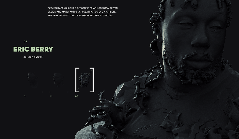 Dele Alli – football player and Eric Berry – american football player. Using the raw data of each athlete’s 3D scan and mixed elements of the process to create unique fluid inspired pieces. Deconstructive design illustrates the process and creation with exposed interior and exterior liquid-like fills. The design plays literally and figuratively on the rising motion of the 3D printing process, creating a cohesive visual.